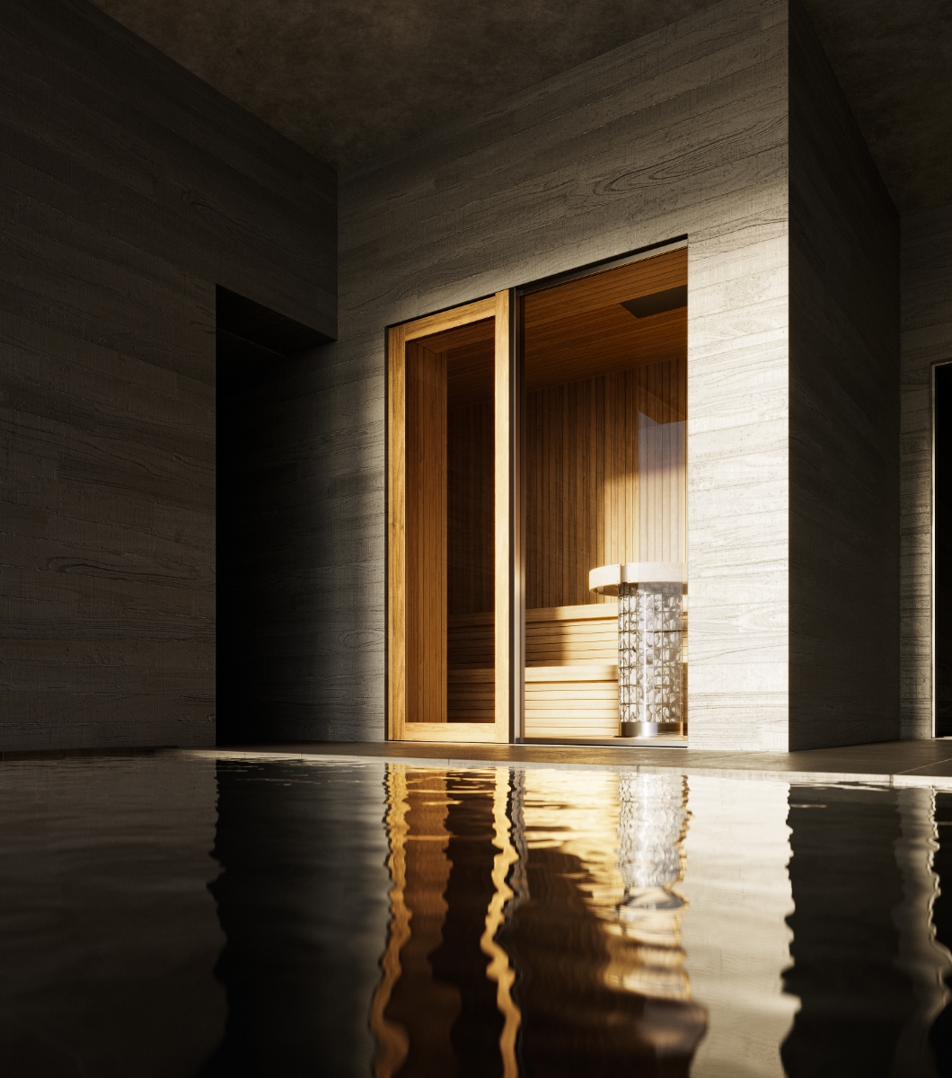 อ่างน้ำที่แสงนุ่มนวลส่องผ่านเข้าสู่ความมืดของถ้ำ,ห้องนอนที่กลมกลืนกับท้องฟ้ายามค่ำคืนที่เต็มไปด้วยดวงดาว