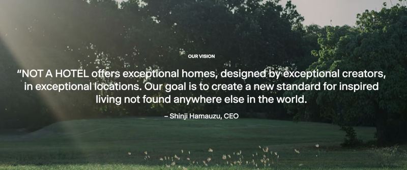 Shinji Hamauzu ได้เห็นความต้องการของนักเดินทางที่ต้องการที่พักที่มีความเป็นส่วนตัวและมีเอกลักษณ์ จึงได้ก่อตั้ง “Not A Hotel” ขึ้นมาในปี 2020 โดยมีเป้าหมายที่จะมอบประสบการณ์การพักผ่อนที่แตกต่างจากโรงแรมทั่วไป ด้วยการออกแบบสถาปัตยกรรมที่มีสไตล์เฉพาะตัวและเน้นการใช้วัสดุคุณภาพสูง และที่สำคัญเป็นธุรกิจแนวใหม่เพราะ เราสามารถซื้อเป็นเจ้าของวิลล่าหลังนั้นได้ แต่สามารถแบ่งให้คนอื่นมาพักได้ และ Not A Hotel จะเป็นผู้บริหารจัดการ และเราเจ้าบ้านก็ได้รายได้จากการให้เช่าด้วย เหมือนกับเป็นการลงทุนซื้ออสังหาริมทรัพย์และได้ Passive Income ไปในตัว