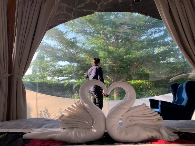 สำหรับใครที่กำลังมองหาที่พักแบบนอนเต็นท์ แต่หรูติดแอร์สไตล์ซาฟารี โอบล้อมด้วยบรรยากาศเงียบสงบเต็มไปด้วยภูเขา ที่นี่จะแบ่งที่พักออกเป็น 3 แบบคือ เต็นท์สำหรับ 2 ท่าน, เต้นท์ขนาดใหญ่ และ บ้านต้นไม้