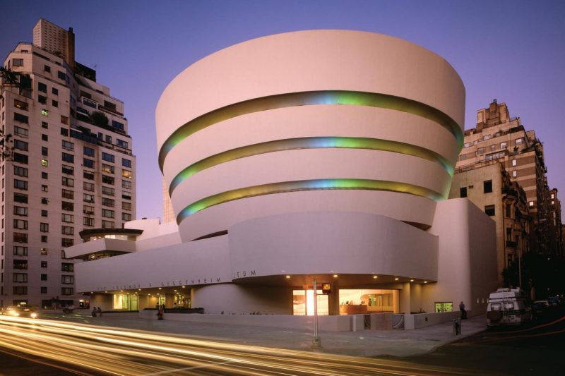 แม้ว่าตัวตึกของ Guggenheim โค้งมนจะอยู่ในหลายๆ ด้าน โลกที่ห่างไกลจากตึกที่สร้างด้วยสถาปัตยกรรมแบบ Cubism เช่น บ้าน Fallingwater ในรัฐเพนซิลเวเนีย แต่ก็ยังมีเครื่องหมายการค้าของ แฟรงก์ ลอยด์ ไรต์ อยู่มากมาย การใช้คอนกรีตเปลือยและโดมแก้วขนาดใหญ่สำหรับผู้เริ่มต้น พิพิธภัณฑ์แห่งนี้สร้างขึ้นเพื่อใช้เก็บสะสมงานศิลปะของโซโลมอน อาร์ กุกเกนไฮม์ และเปิดได้หกเดือนหลังจากไรท์เสียชีวิต เดิมทีไรต์ต้องการให้ภายนอกเป็นสีแดงสด ซึ่งสถาปนิกเชื่อว่าเป็น “สีสันแห่งการสร้างสรรค์”