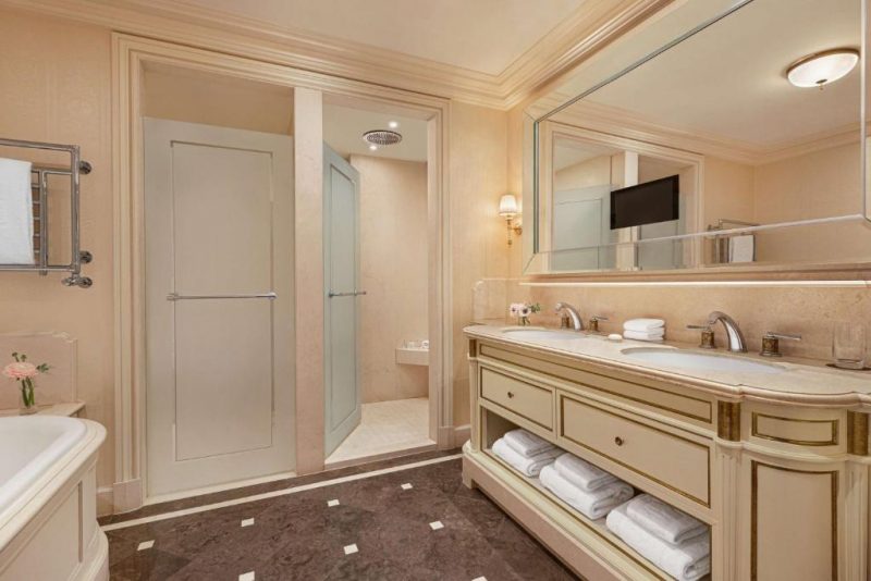 Le Meurice – Dorchester Collection โรงแรมหรูที่ตั้งอยู่ใจกลางเมืองปารีส ห้องพักสวยหรูหราตกแต่งในสไตล์ยุคคริสต์ศตวรรณที่ 18 เฟอร์นิเจอร์สไตล์หลุยส์ที่ 16 ห้องพักกว้างขวางเป็นสัดส่วนทั้งห้องนอนและห้องพักผ่อน ห้องน้ำตกแต่งหินอ่อนขนาดกว้างขวางมากๆ โรงแรมในวังแห่งนี้มีห้องอาหารระดับดาวมิชลิน Le Meurice มีห้องอาหารฝรั่งเศสระดับกูร์เมต์โดยเชฟ Alain Ducasse ห้องอาหารขนาดใหญ่ได้รับแรงบันดาลใจจาก Salon de la Paix ในพระราชวังแวร์ซายโดย Philippe Starck ให้บริการอาหารตลอดวัน ครื่องดื่มกว่า 300 รายการและการแสดงดนตรีสดแนวแจ๊สทุกคืน